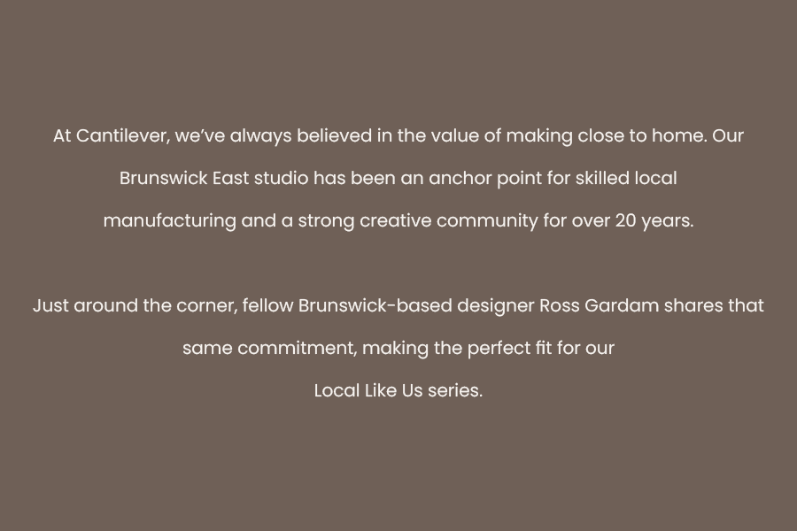 Both Ross Gardam and Cantilever have spent years honing their design practices in Brunswick. “I have been an admirer of Cantilever for many, many years so it feels really special to be featured in more projects together,” Ross says, acknowledging how the creative studios in the area all add to the vibrancy of the local design community.